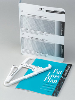 Plastic callipers with fixed pressure measuring system that records fat measurement on a slider for viewing away from the subject.